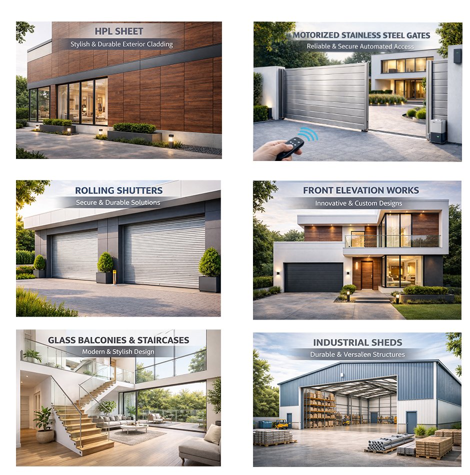 Ready to upgrade your space with our superior metal creations? Visit our Metal Creations facility in Ambattur, Chennai, or reach out for a personalized quotation. Whether you’re looking for motorized gates, stainless steel works, glass balconies & staircases, industrial sheds, rolling shutters, HPL sheet cladding, or front elevation works, Metal Creations is your trusted partner. All our products are crafted with precision and high-quality materials, ensuring durability, safety, and lasting performance.